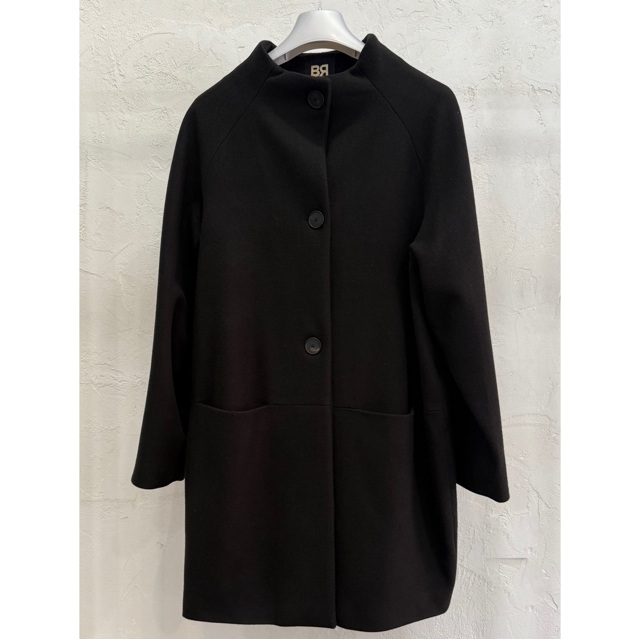 ABRIGO DE PAÑO, CUELLO REDONDO Y MANGA RANGLAN. CIERRE FRONTAL CON BOTONES Y BOLSILLOS PLASTRON. BRUNELLA.