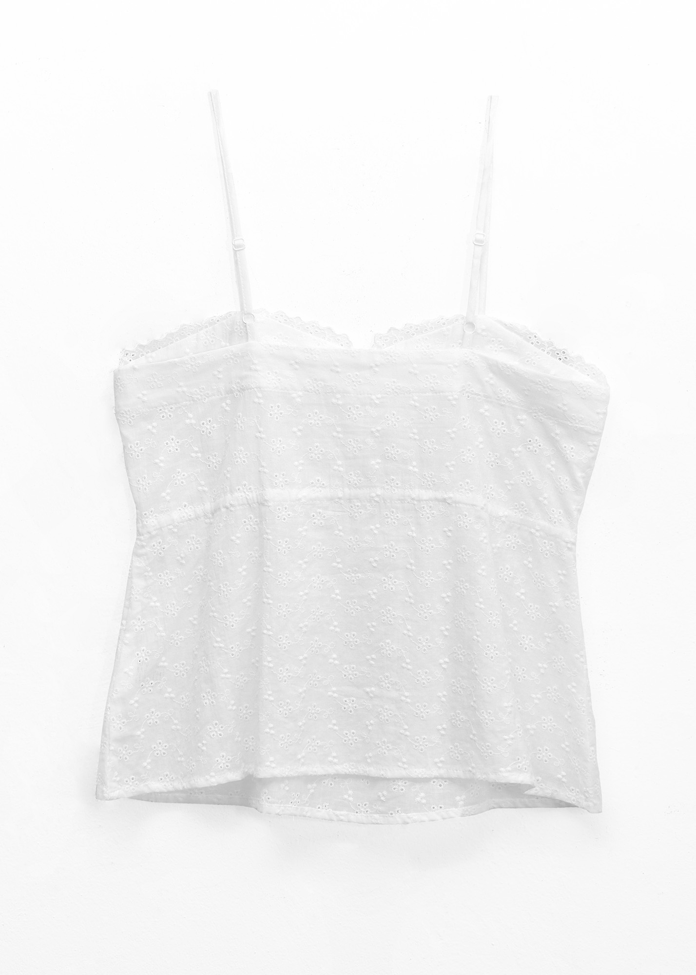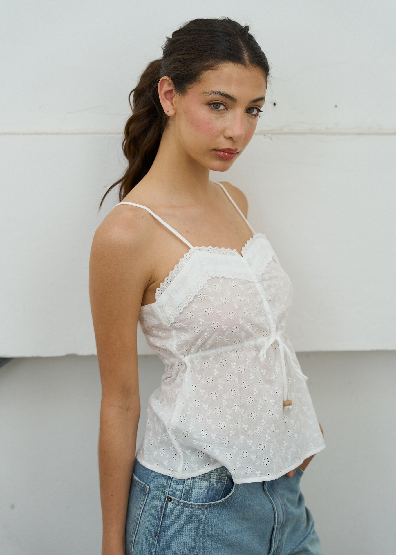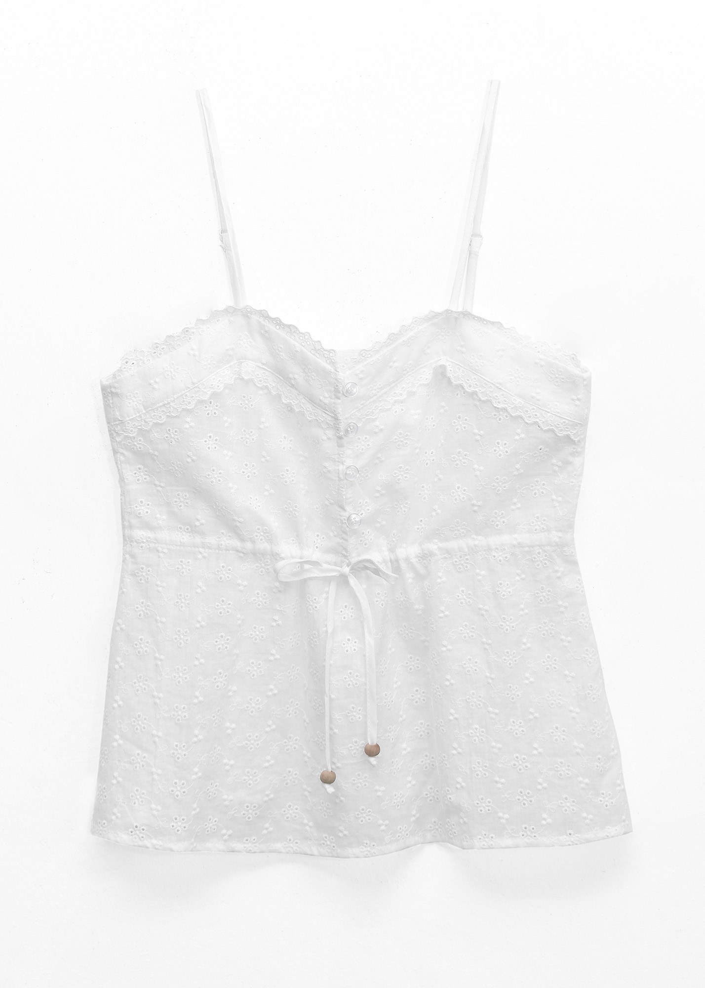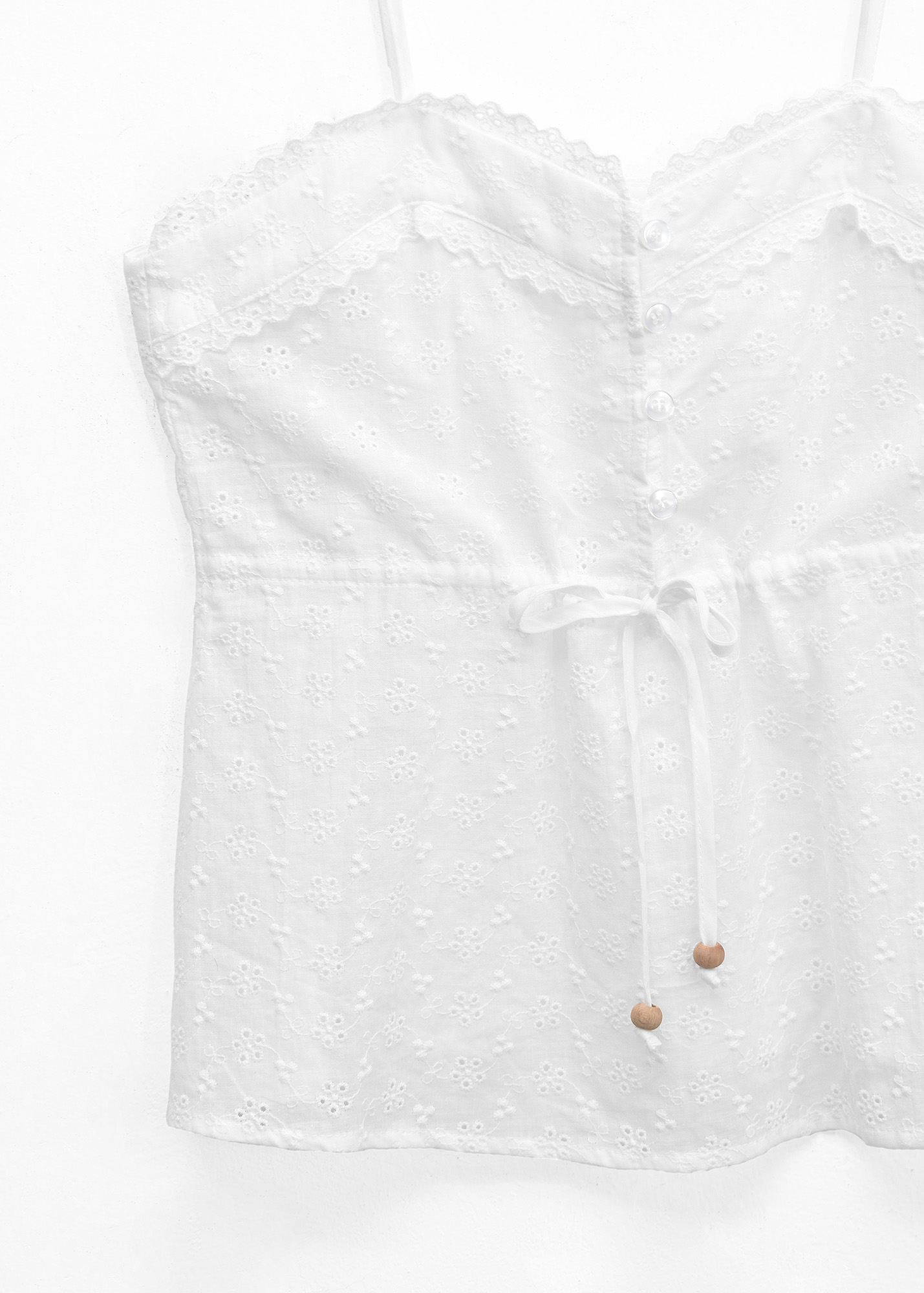 Blusa de broderie con detalle de puntilla, bordado. Botones delanteros y frunce con tiras para ajustar